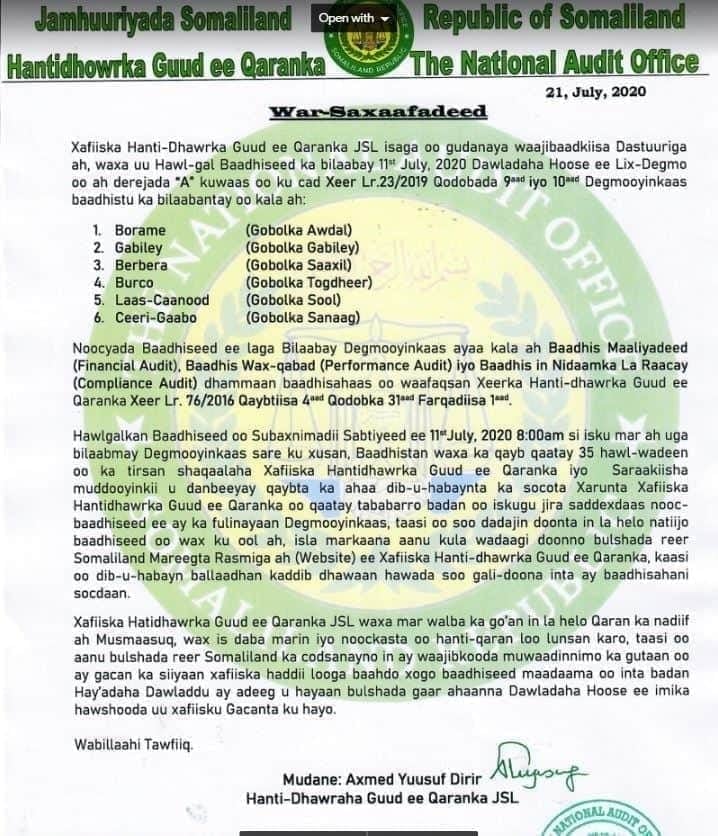 Xafiiska Hantidhawraha Oo Shaaciyey Baadhis Uu Ka Bilaabay Shan Ka Mid Ah Dawladaha Hoose.