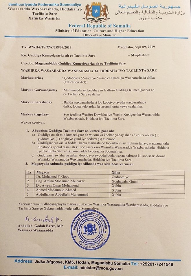 Dawlada Soomaaliya Oo Shaacisay Guddida Ku Meelgaadhka Ah Ee Tacliinta Sare