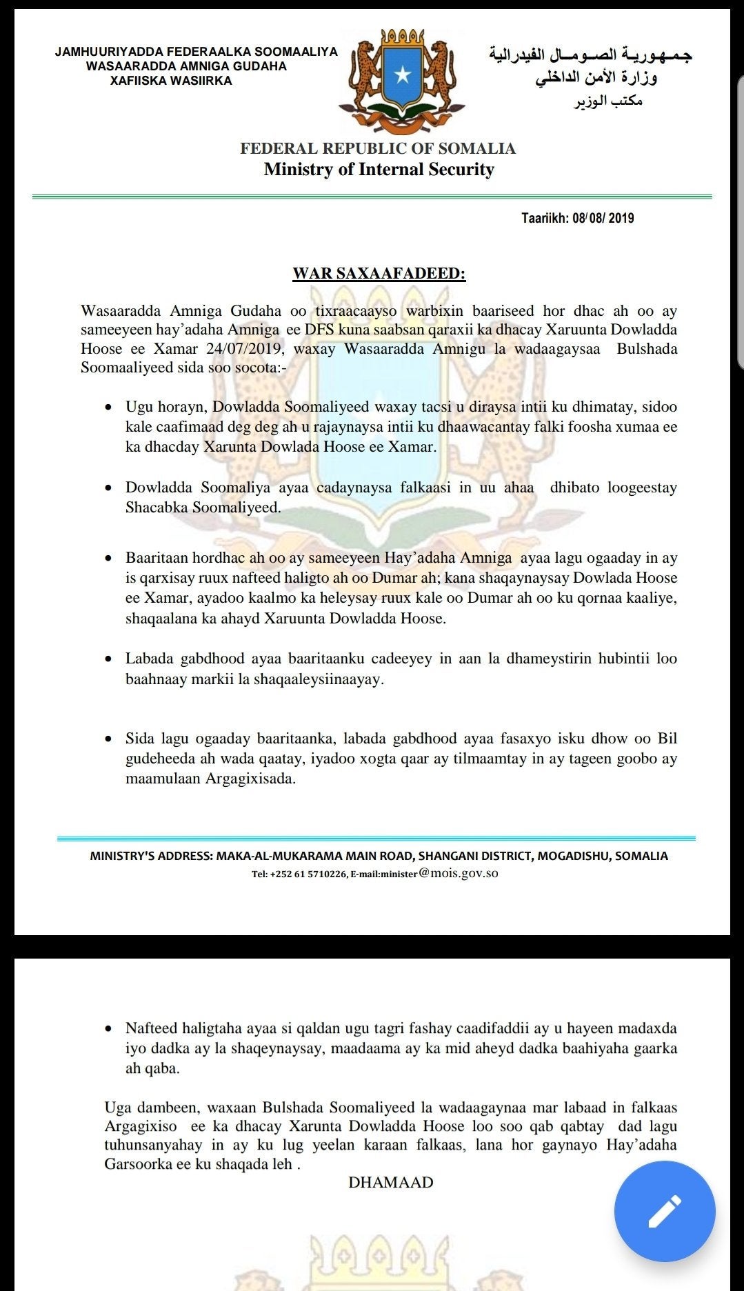 Kismaayo (HWN) -Wasaaradda arrimaha gudaha Soomaaliya ayaa go'aan xasaasi ah ka soo saartay