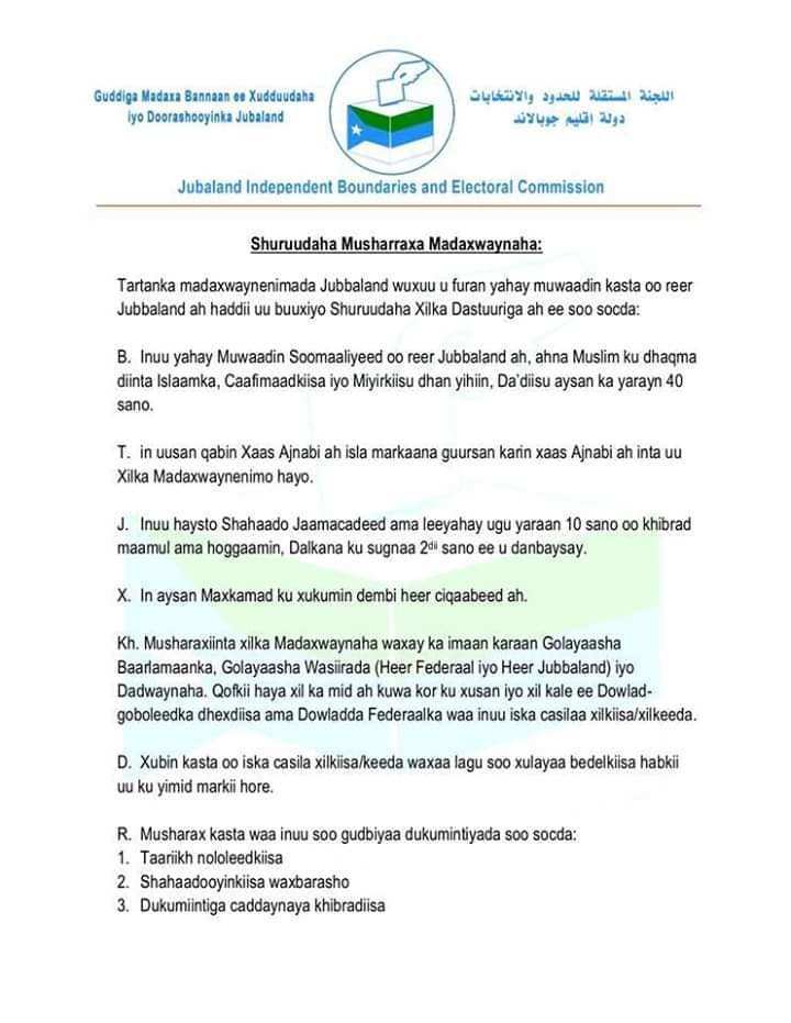Shuruudo Adag Oo La Dul Dhigay Murashaxiinta U Tartamaya Doorashada Maamulka Jubboland