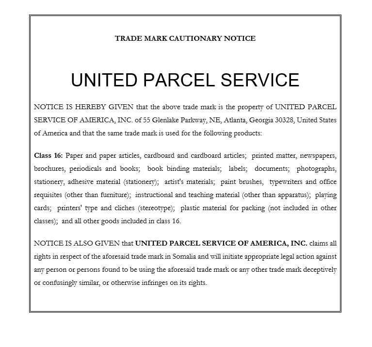 TRADE MARK CAUTIONARY NOTICE - UNITED PARCEL SERVICE
