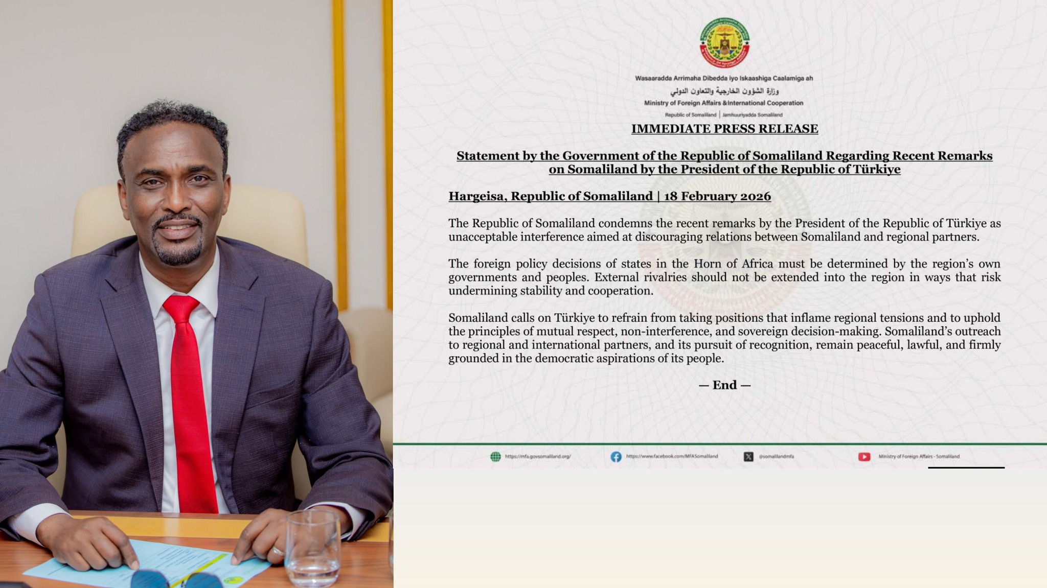 Somaliland ayaa ugu baaqday Turkiga inuu ka waantoobo mawqifyo hurin kara xiisado, isla markaana uu ixtiraamo mabaadi’da is-qaddarinta, faragelin-la’aanta iyo xaqa ummad walba u leedahay go’aan-qaadasho madax-bannaan.
