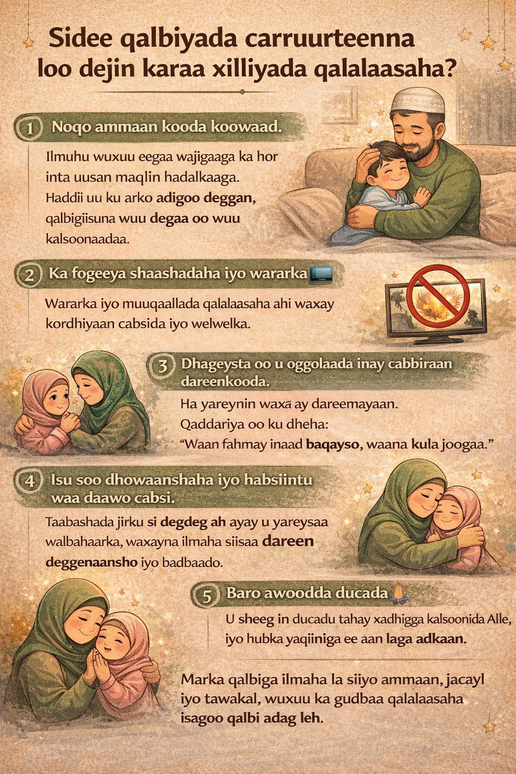 Marka qalbiga ilmaha la siiyo ammaan, jacayl iyo tawakal, wuxuu awood u yeeshaa inuu ka gudbo xaaladaha adag isagoo leh qalbi xooggan iyo kalsooni.