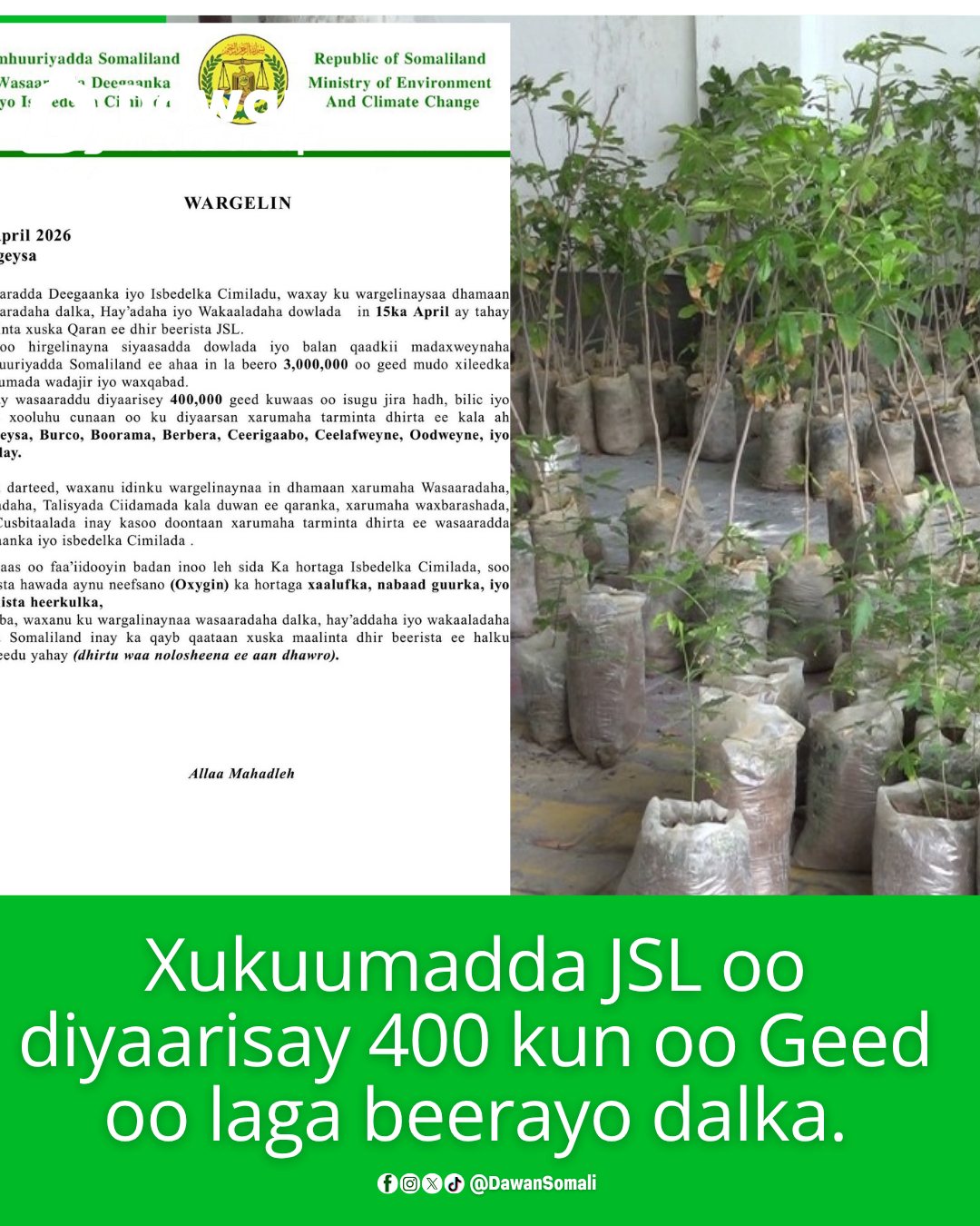 Warqad ogaysiin ah oo ka soo baxday wasaaradda ayaa lagu wargeliyey wasaaradaha, hay’adaha iyo wakaaladaha dowladda inay qaataan doorkooda, isla markaana ka qayb qaataan qaadashada iyo beerista dhirtaas, taas oo qayb ka ah fulinta ballanqaadkii Madaxweynaha JSL ee ahaa in la beero 3 milyan oo geed muddada xilkiisa.